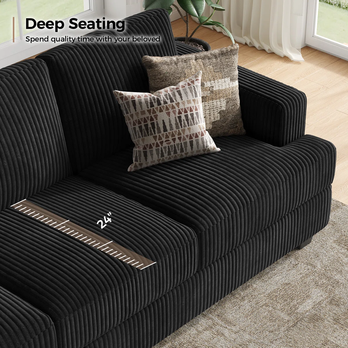 This is an 89 inch sofa equipped with soft and fluffy back and seat cushions, which can bring you a long-lasting and comfortable sitting experience. The sofa is covered with breathable fabric, designed with a sturdy hardwood base, the maximum weight capacity can reach up to 700 pounds. If you want to add a comfortable sofa to a your living room, our deep seat sofa can bring you an excellent user experience.
